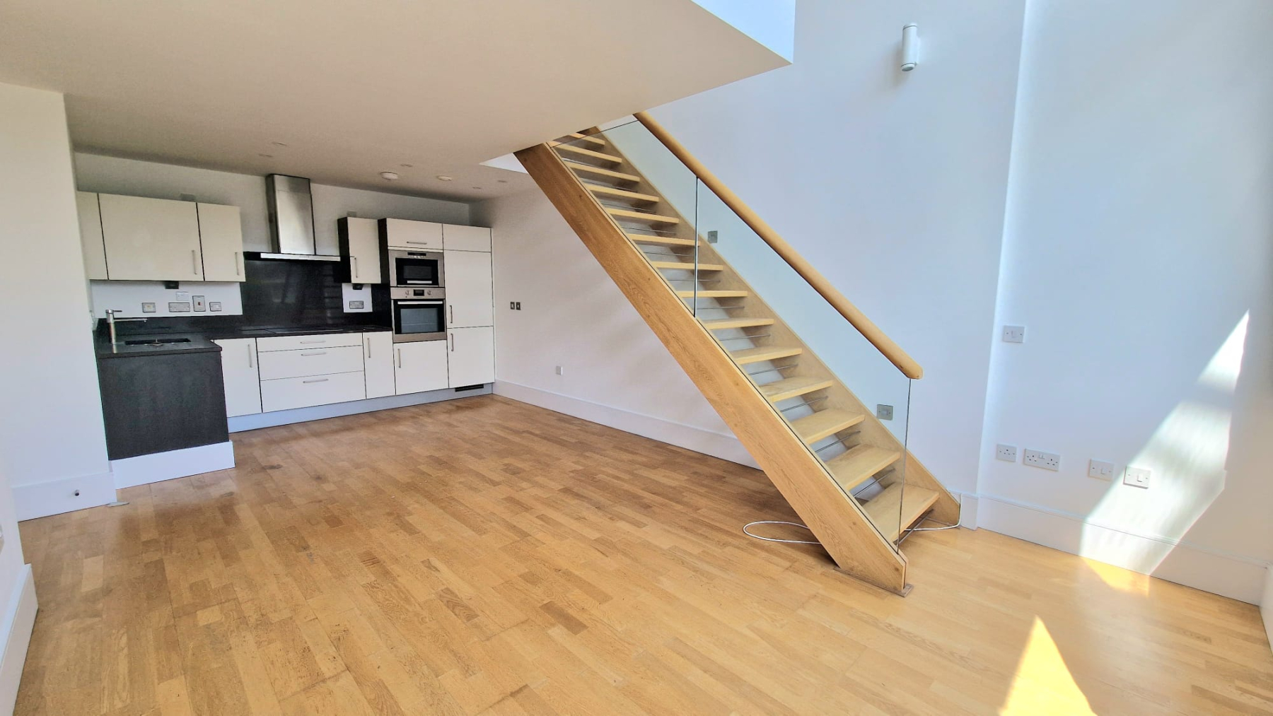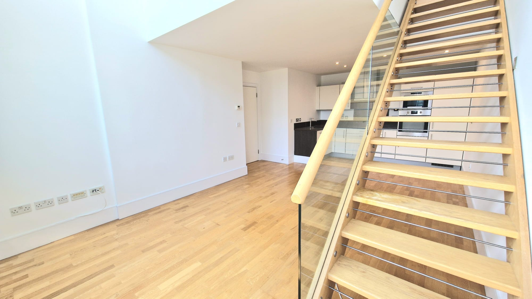 The open plan living room offers attractive wood flooring and under floor heating. The kitchen is fully fitted and there is a separate washing machine utility cupboard. Both bathrooms are beautifully appointed with one bathroom and shower room. A large master bedroom and second mezzanine bedroom above the reception room all principal rooms offering views of the communal gardens. Ample storage throughout.